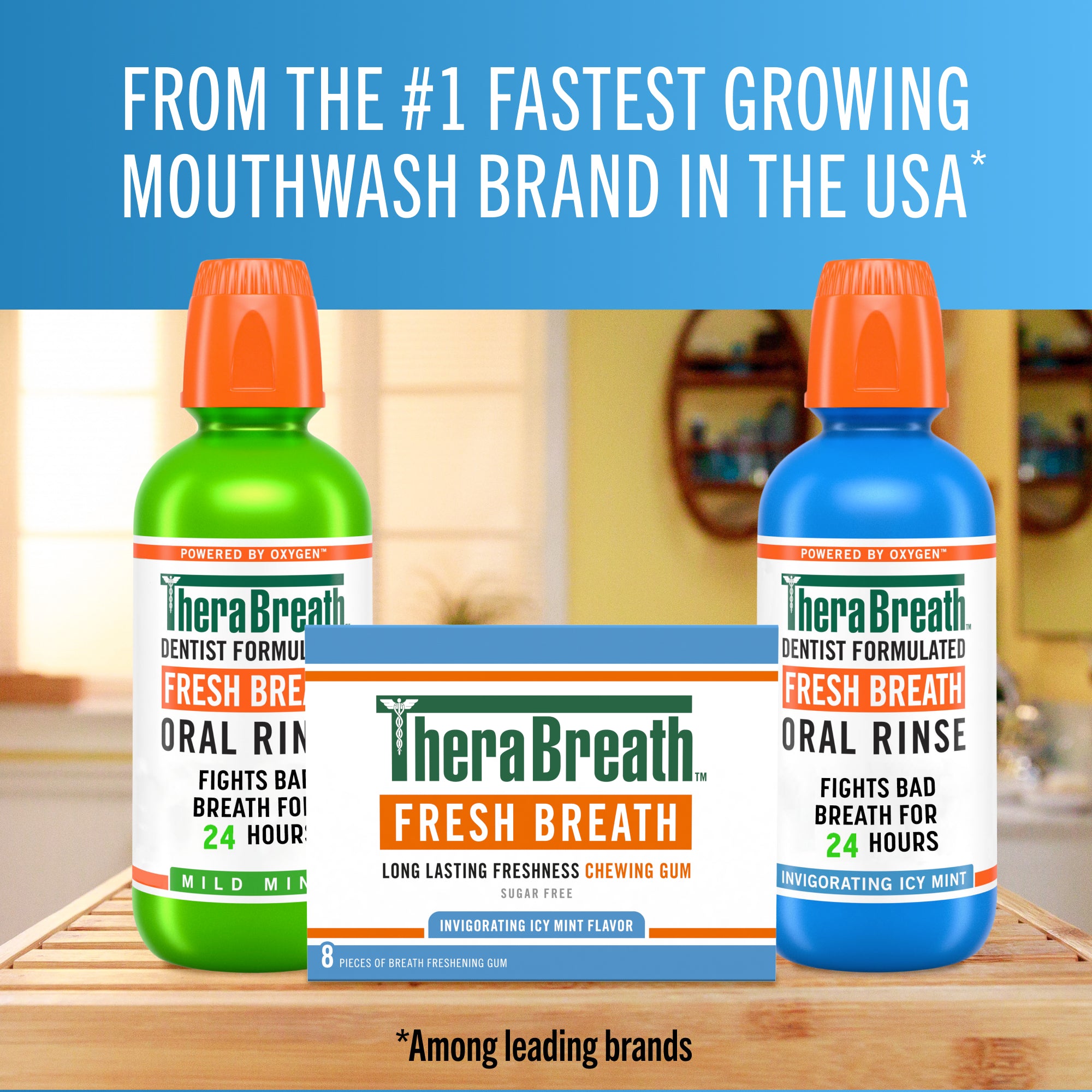 Meet TheraBreath Invigorating Icy Mint Chewing Gum. a pocket-sized breath freshening gum that keeps bad breath at bay while you’re out and about. Enjoy that revitalizing fresh breath feeling without swishing. Each piece of our Fresh Breath gum is crafted with a unique three-layer design. Every satisfying bite of the crunchy outer shell gives way to a soft. chewy center. So whether you’ve just enjoyed a garlic-heavy meal or a strong coffee. you’ll be ready to face whatever comes your way with confidence. The only thing lingering here is long lasting icy mint freshness. TheraBreath Fresh Breath Chewing Gum is a dentist-formulated. guilt-free treat with zero calories. no sugar. no aspartame. and no dyes. It’s also certified vegan. hala and gluten-free. As with all TheraBreath Products. your satisfaction is completely guaranteed or your money back!
