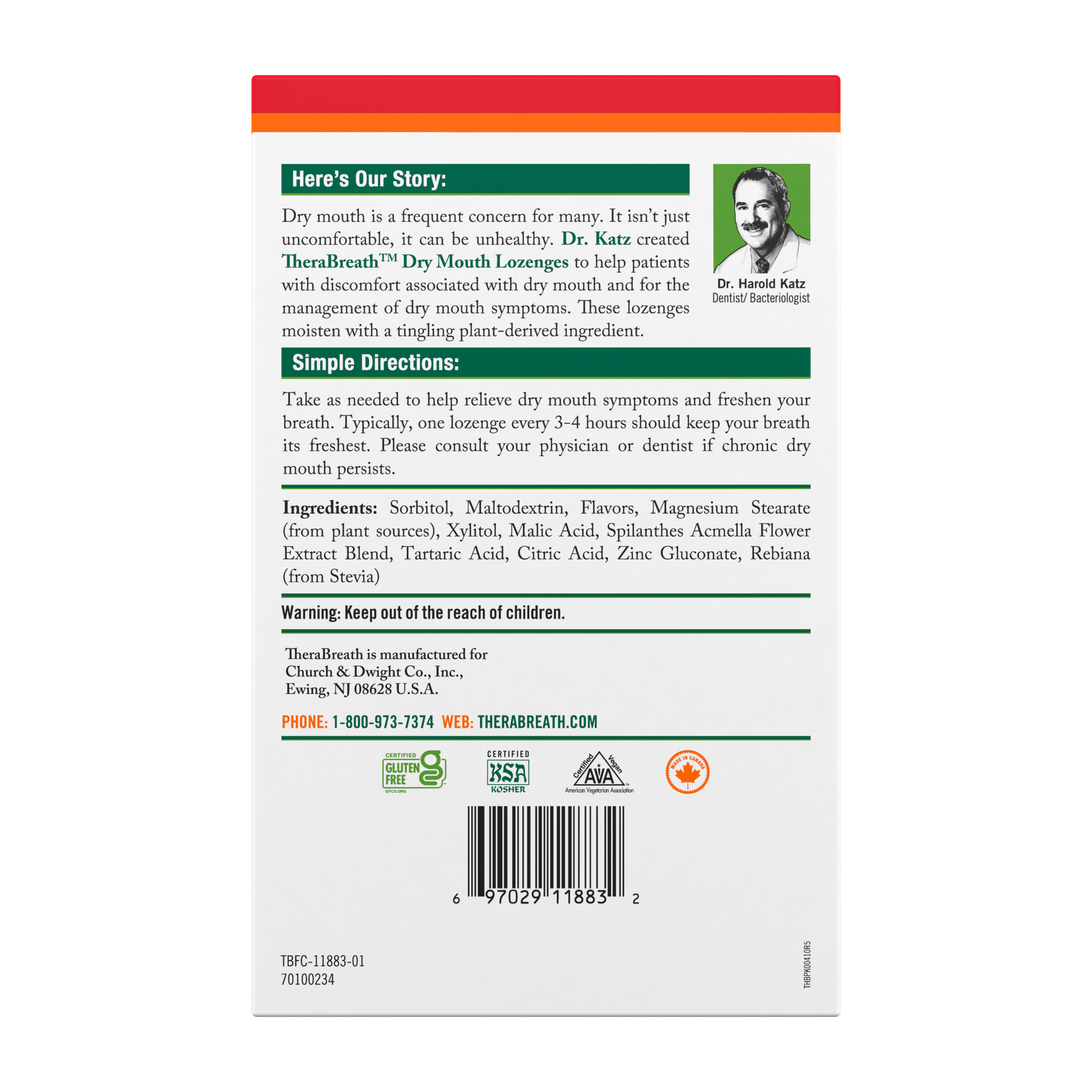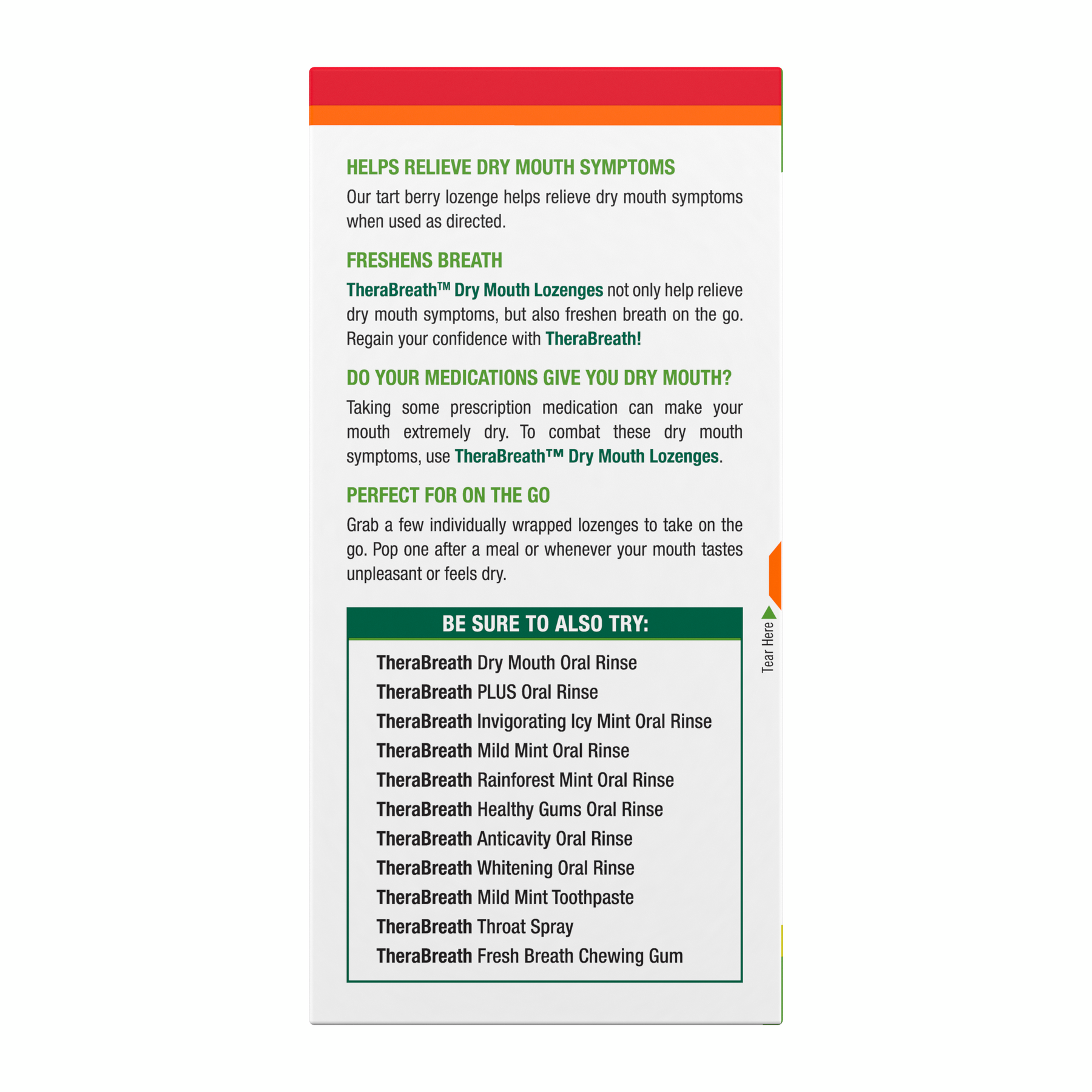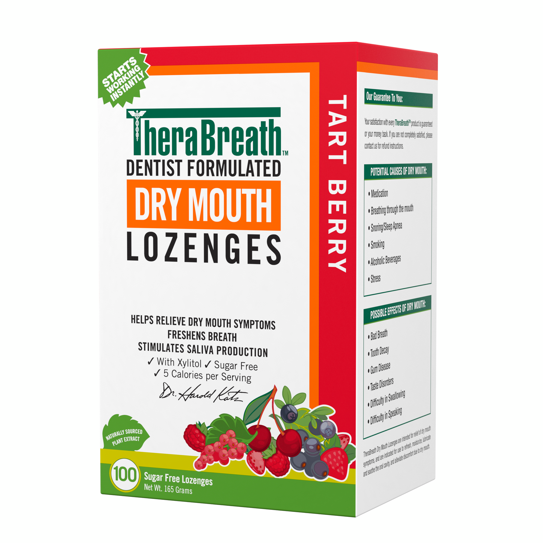 Dry mouth is much more than an uncomfortable feeling. Saliva is the body’s natural defense against the bacteria that cause bad breath. Fortunately. when your mouth is feeling dry when you’re on-the-go. there’s an on-the-go solution. TheraBreath Dry Mouth Lozenges.TheraBreath Dry Mouth Lozenges relieve dry mouth symptoms and freshen breath. The pleasant citrus mint formula eliminates unpleasant tastes or odors in your mouth. The tingling Tart Berry flavor enhances saliva flow to help relieve dry mouth symptoms.TheraBreath Dry Mouth Lozenges are individually wrapped for your convenience. Throw a few in your pockets or purse to have fresh breath confidence throughout the entire day. Available in a small. 24 count box you can bring with you as you travel.We’re so confident in TheraBreath Dry Mouth Lozenges that we back it up with our 100% guarantee. If you haven’t seen improvement in your dry mouth symptoms. contact us within 30 days of purchase for a full refund.